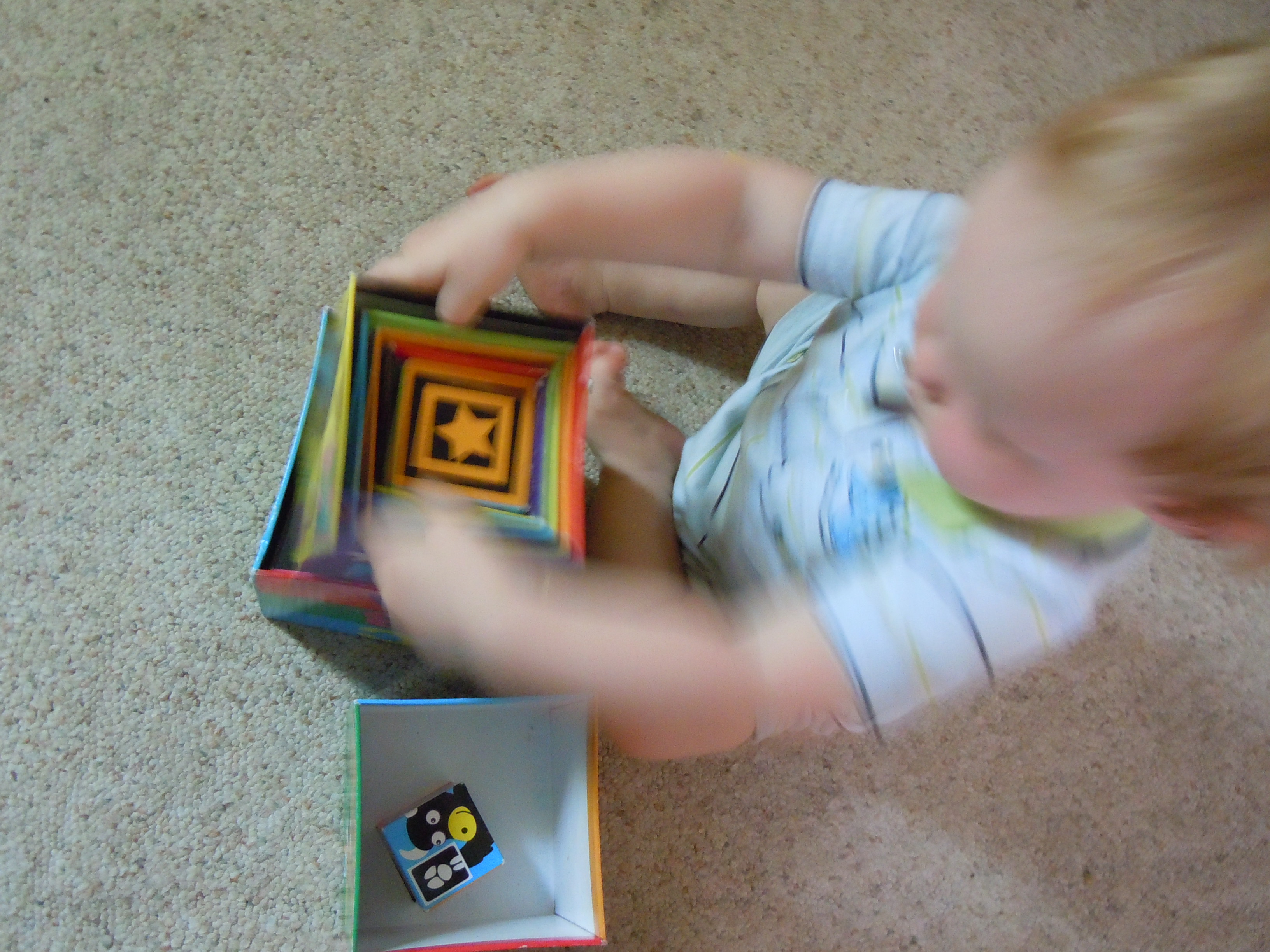 Bl turned out to be much more interested in figuring out which boxes would fit into each other. Some of this may be due to the fact putting “something in” is more forgiving than “stacking on”, so Bl could experience more success at this developmental stage.