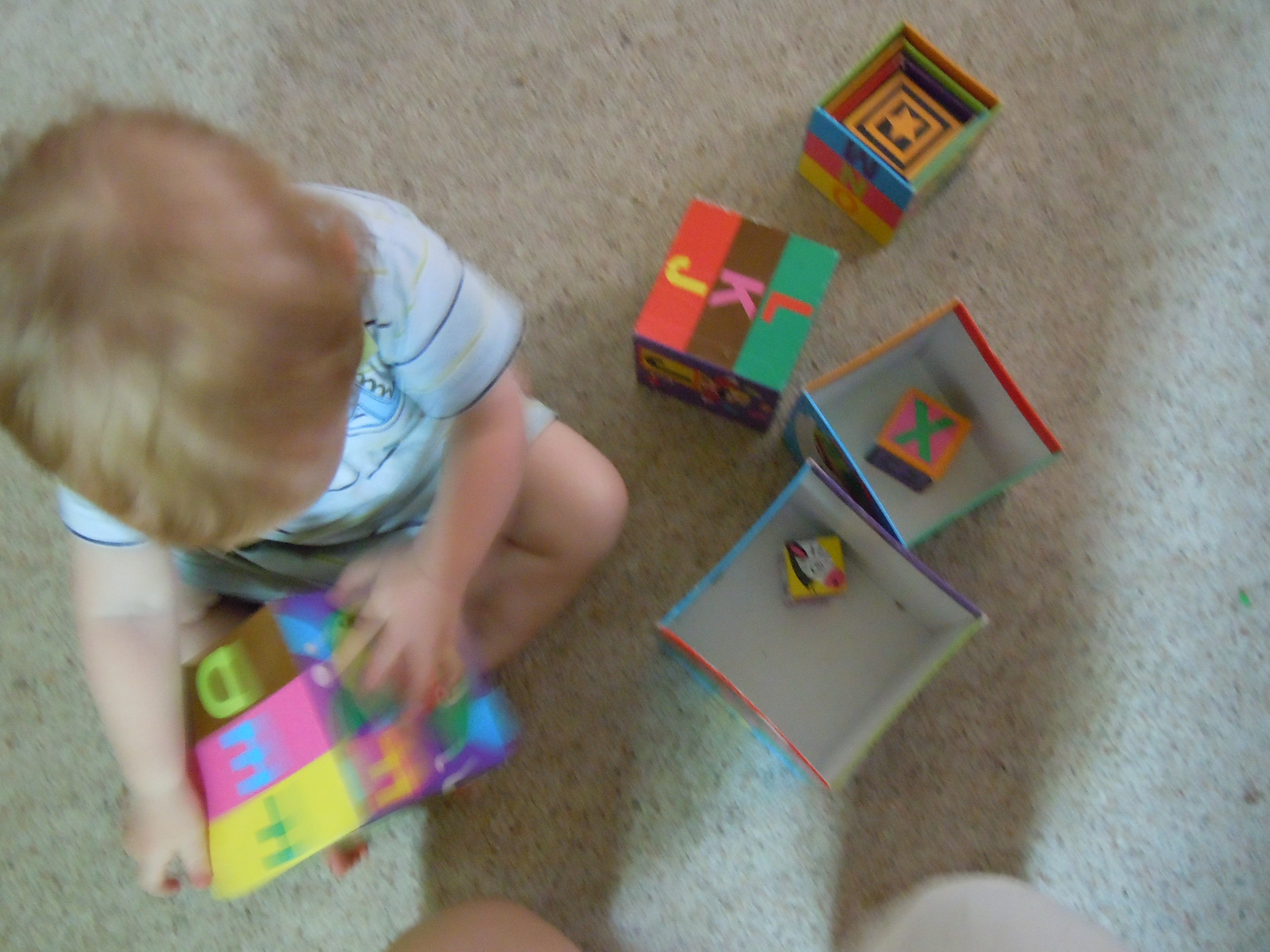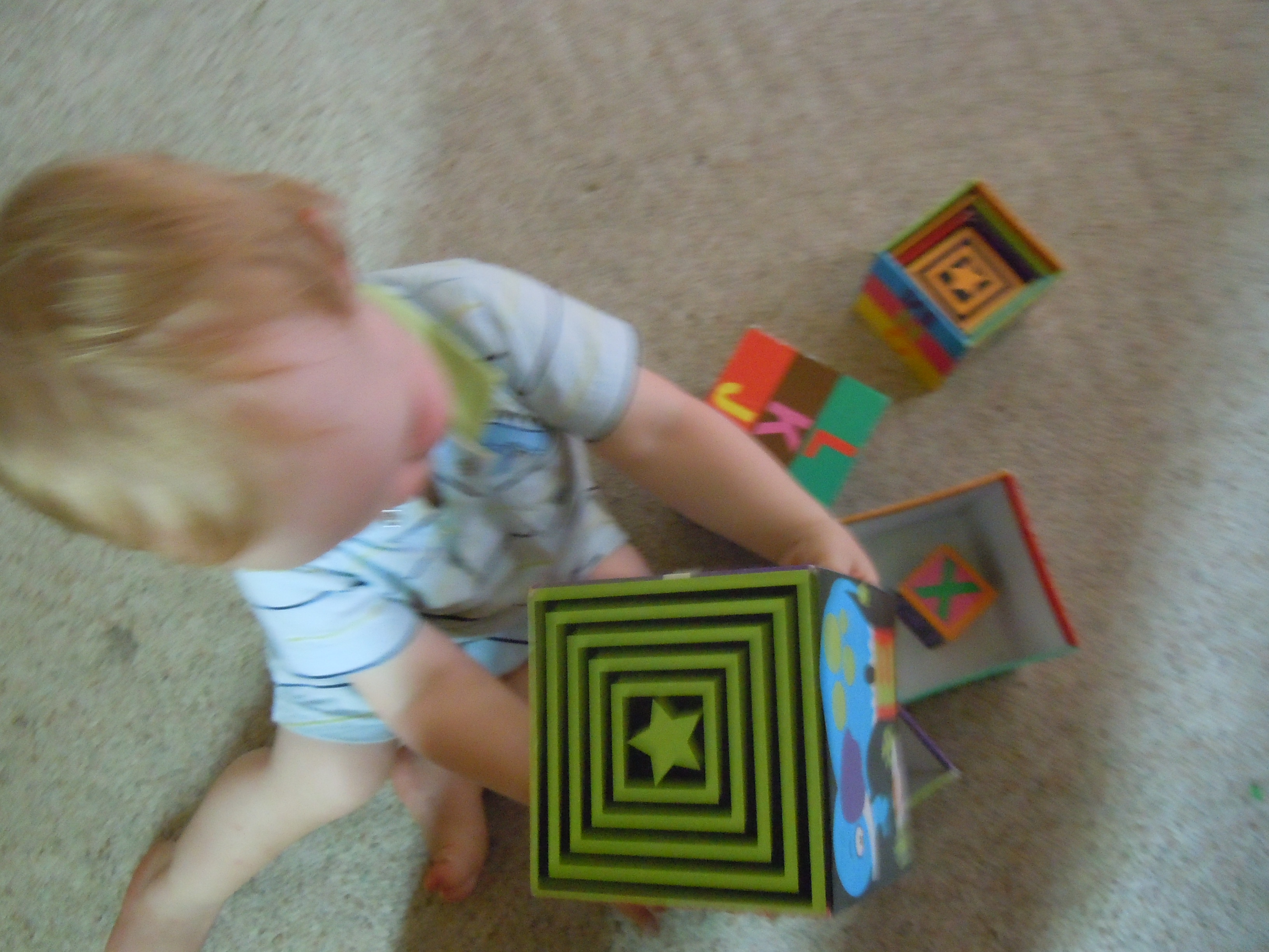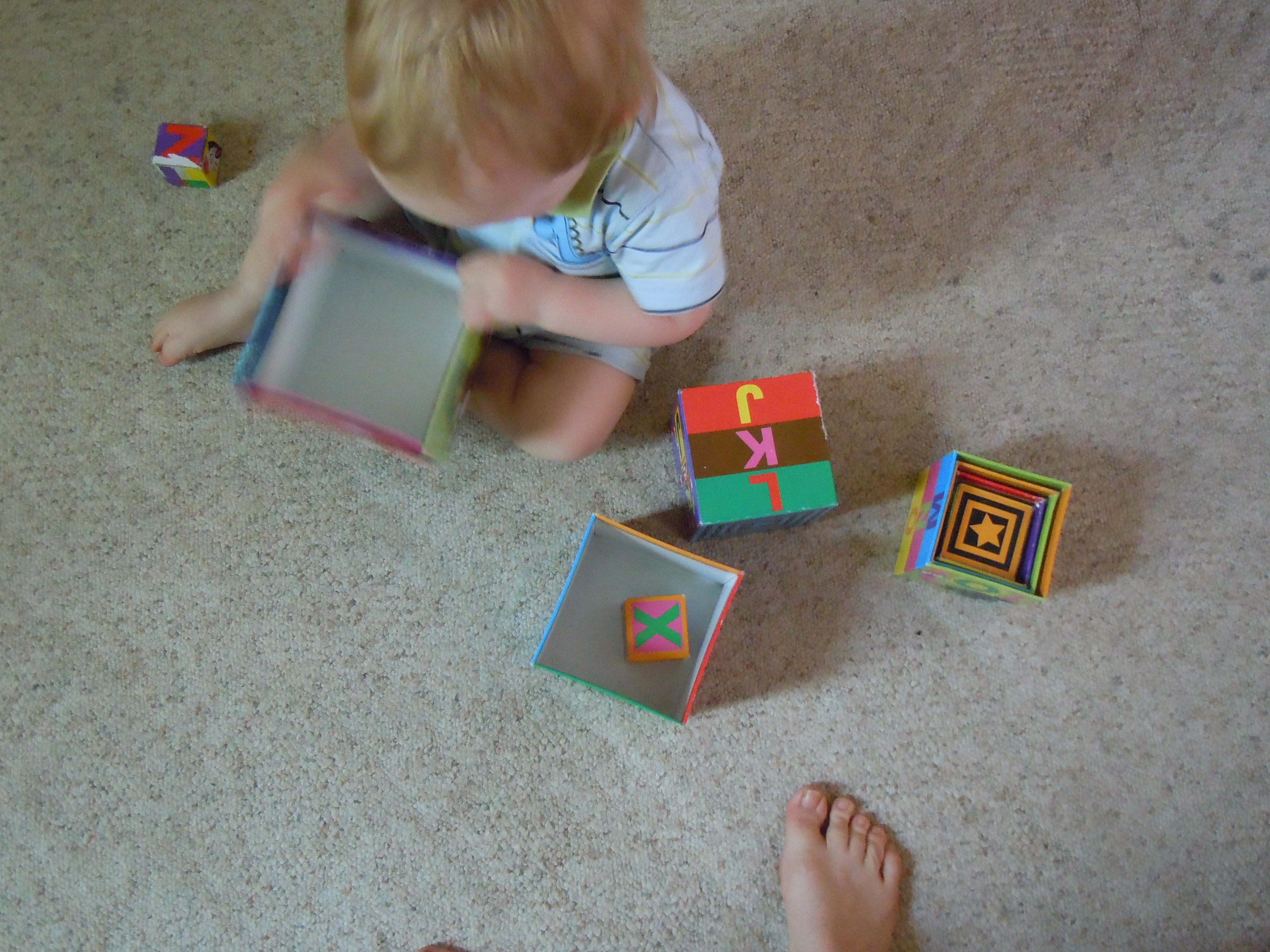I pulled this set of nesting boxes (by Melissa & Doug) off the shelf for Bl (15 mo) to check out. Initially I showed him how to stack them, which was really “how fast can Mommy stack relative to how quickly can Bl knock down.” Bl can knock down pretty quickly. Therefore, no pictures. 🙂